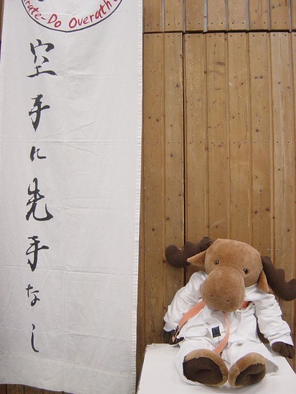 Eine Weile saß ich einfach herum, doch dann dachte ich darüber nach, ob ich mich zu euch geselle und euch etwas Mut vor euren anstrengenden Prüfungen mache. Ihr saßt nämlich genauso herum und saht ziemlich aufgeregt und nervös aus. Schließlich nahm ich mir ein Herz und schlich mich vorsichtig an euch heran. Sofort wurde ich liebevoll von euch aufgenommen und in den Arm genommen. Leider habe ich mich nicht zu allen Kindern getraut. Das liegt daran, dass wir Karate-Elche ursprünglich von den echten Elchen abstammen und die leben ja im Norden, wo wenig Menschen sind. Daher bin ich etwas schüchtern. Aber natürlich hab ich euch allen zugeschaut und fand es richtig toll, was für enorme Leistungen ihr vollbracht habt. Einmal wurde ich beim Laufen eine Runde mitgenommen, und ihr wisst gar nicht wie mir danach die Beine schlotterten und das Geweih wackelte!!! Und wenn ich mir jetzt vorstelle, dass ihr 7 Runden gelaufen seid…WOW!!!