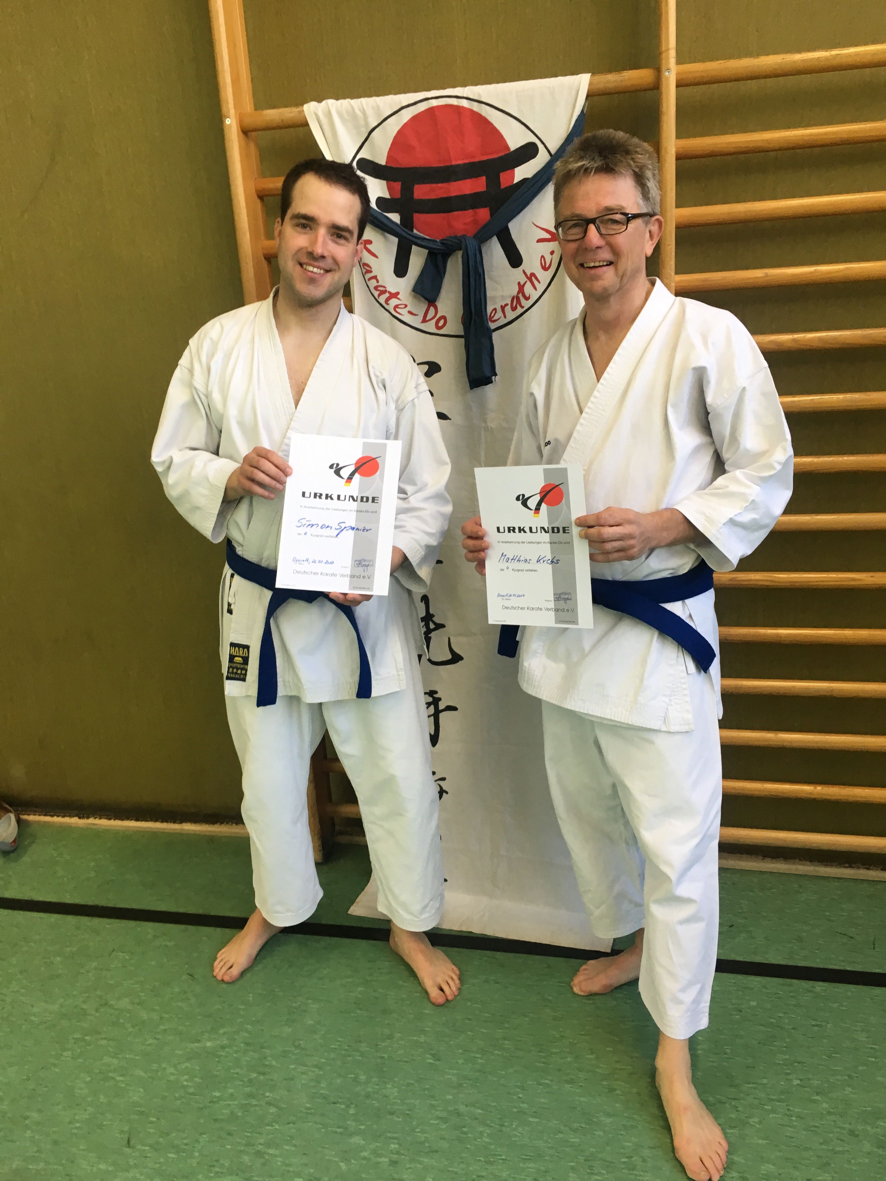 Unser Nachwuchs drängt sich langsam nach vorne. Simon und Matthias (...kurz vor seinem 60sten Geburtstag) haben erfolgreich und mit sehr gutem Ergbenis ihre Prüfung zum 4. Kyu abgelegt. Jetzt ist es nicht mehr weit bis zum brauen Gürtel.
