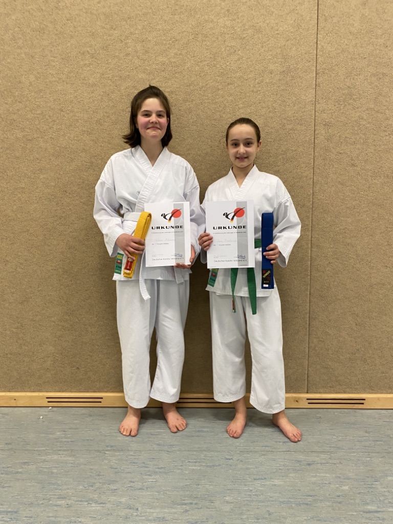 Am 1. April wurde es in der großen Kindergruppe ganz still, als Helena und Jana zu ihren Prüfungen antraten. Während Helena mit sehr kraftvollen Techniken und einer sicheren Kata zum 8. Kyu überzeugen konnte, zeigte Jana, dass zum blauen Gürtel noch einiges mehr dazu gehört. Sie hat in den letzten Monaten intensiv trainiert und viele Feinheiten optimiert, sodass auch sie die Prüfung zum 5. Kyu super gemeistert hat.
