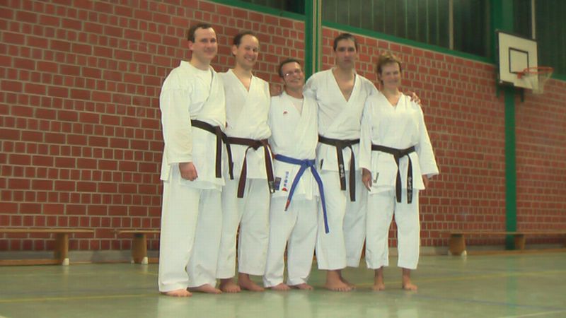 Neben Björn, der seine erste Prüfung zum gelben Gürtel ablegte, traten auch Kerstin, Steffen und Ralf zur Prüfung zum 1. Kyu - der letzten Hürde vor dem begehrten schwarzen Gürtel -an. Zwölf DAN-Träger des Vereins