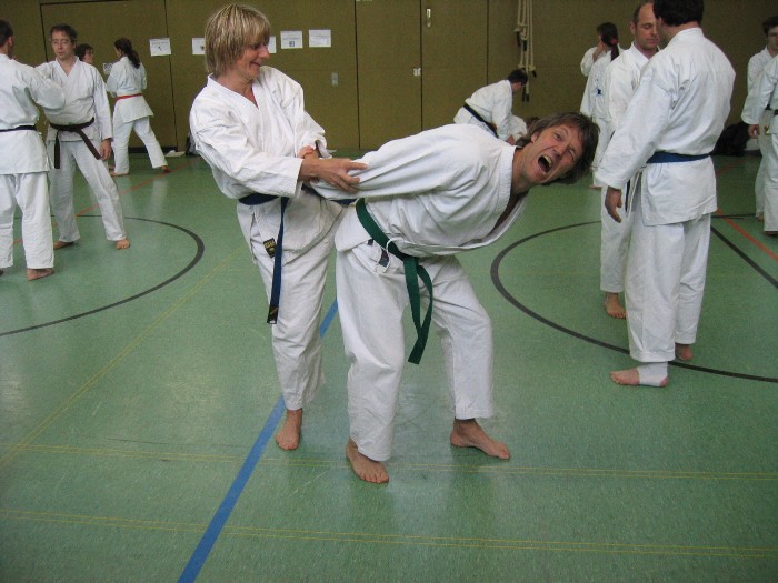 Kann man das wirklich brauchen, was wir im Kumite lernen? Freikampf wird für die meisten älteren nicht mehr zum Standardrepertoire gehören - was also tun wenn einen das "wirklichen Leben" einholt? Eine (erste) Antwort darauf gab Petra Theobald (2. Dan) im Seminar "Selbstverteidigung" am
